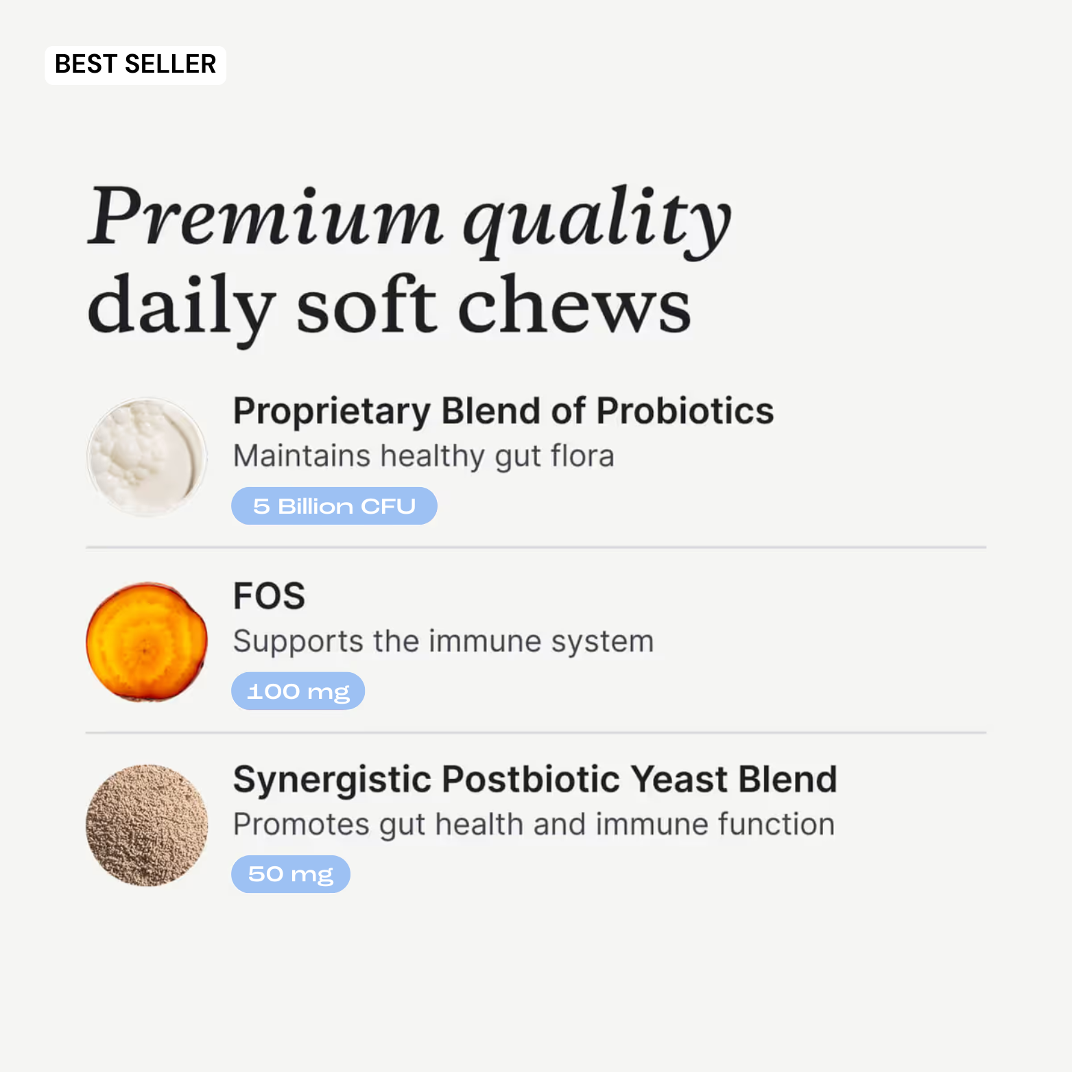A powerful blend of probiotics, prebiotics, and postbiotics helps maintain balanced gut flora, support digestive function, and keep stools firm and healthy.